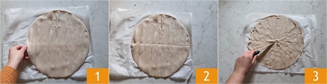 Um die Blätterteig-Croissants mit Lachs zuzubereiten, rollen Sie zuerst den Blätterteig auf einer Arbeitsfläche aus 1. Verwenden Sie ein scharfes Messer und teilen Sie ihn zunächst in 4 Stücke 2, dann schneiden Sie jedes Stück in 4 weitere, um insgesamt 16 Stücke zu erhalten 3.