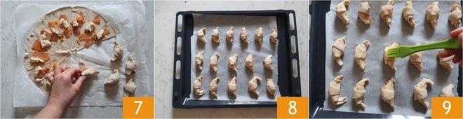 Rollen Sie jedes Stück von der Basis aus, um ihm die Form eines Croissants zu geben 7. Legen Sie die Croissants nach und nach auf ein mit Backpapier ausgelegtes Blech und lassen Sie etwas Abstand zwischen ihnen 8. Schlagen Sie das Eigelb mit der Milch zusammen und verwenden Sie es, um jedes einzelne Croissant zu bestreichen 9