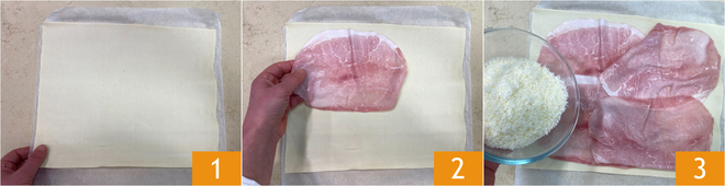Um die Blätterteig-Grissini zuzubereiten, rollen Sie den Blätterteig auf der Arbeitsfläche mit seinem Backpapier aus 1. Legen Sie die Schinkenscheiben über die gesamte Oberfläche, dabei 1 cm Rand freilassen 2, dann mit geriebenem Parmigiano Reggiano bestreuen 3.