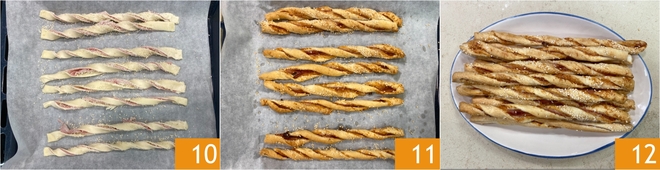 Legen Sie die Grissini nach und nach auf ein mit Backpapier ausgelegtes Backblech 10 und backen Sie sie im vorgeheizten Umluftofen bei 170°C etwa 25 Minuten. Sobald sie goldbraun sind, aus dem Ofen nehmen 11 und abkühlen lassen. Ihre Blätterteig-Grissini sind bereit, serviert zu werden, kalt oder warm 12!