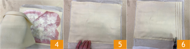 Bedecken Sie mit der zweiten Blätterteigrolle 4 und versiegeln Sie die Ränder, indem Sie mit den Fingern drücken 5. Schneiden Sie mit einem Teigschneider Streifen von etwa 1 cm Breite 6.