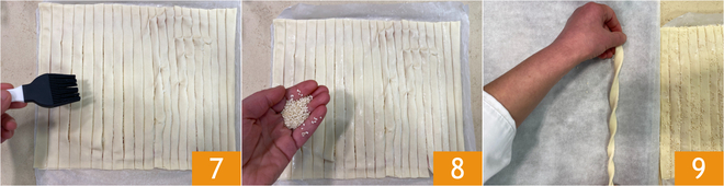 Bestreichen Sie die Oberfläche mit Wasser 7 und bestreuen Sie sie mit Sesamsamen 8. Nehmen Sie nun einen Streifen nach dem anderen und drehen Sie ihn, um eine Spirale zu formen 9.