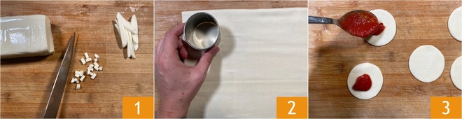 Um die Blätterteig-Pizzetten in der Heißluftfritteuse zuzubereiten, schneidet zuerst den Pizzakäse in sehr kleine Würfel 1. Rollt nun den Blätterteig aus und stecht mit einem Ausstecher Kreise mit einem Durchmesser von 6 cm aus 2. Legt die Blätterteigkreise auf ein Schneidebrett und bestreicht sie mit der Tomatensauce 3.