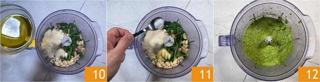 Zum Schluss gebt das Öl 10 und das Salz 11 hinzu und mixt, bis ihr eine cremige, aber etwas rustikale Konsistenz erreicht 12.
