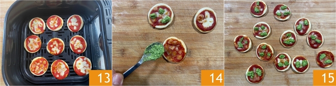 Einmal gebacken 13, garniert die Blätterteig-Pizzetten mit ein paar Tropfen Rucola-Pesto 14. Eure Blätterteig-Pizzetten in der Heißluftfritteuse sind bereit zum Genießen 15!