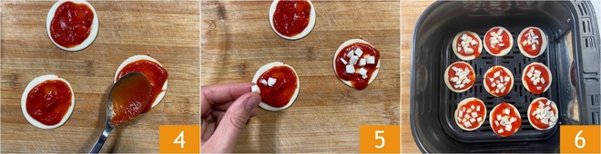 Verteilt die Sauce gleichmäßig mit der Rückseite eines Löffels 4, fügt dann die Käsewürfel hinzu 5. Legt die so belegten Pizzetten in den Korb der Heißluftfritteuse 6 und backt sie bei 150° für 6 Minuten.