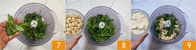 In der Zwischenzeit bereitet das Rucola-Pesto vor: Gebt den gewaschenen und getrockneten Rucola in einen Mixer mit Klingen 7, fügt dann die geschälten Mandeln 8 und den geriebenen Pecorino 9 hinzu.