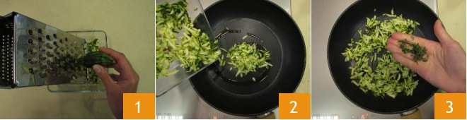 Um die Blätterteig-Schnecken mit Zucchini und Schinken vorzubereiten, waschen und trocknen Sie die Zucchini. Schneiden Sie die Enden ab und reiben Sie sie dann mit einer groben Reibe 1. Erhitzen Sie eine Pfanne mit etwas Öl und geben Sie die Zucchini hinzu 2, würzen Sie mit Salz, Pfeffer und Thymian und lassen Sie sie 5 Minuten bei mittlerer Hitze kochen. Sie sollten gut getrocknet sein 3.