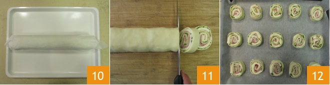 und verschließen Sie auch die Seiten gut 10. Legen Sie sie für mindestens 2 Stunden in den Kühlschrank, so ist es leichter, die Röllchen zu schneiden. Nach der Zeit schneiden Sie etwa 2 cm breite Röllchen, sodass Sie 12 gleichmäßige Stücke erhalten 11. Legen Sie sie auf ein mit Backpapier ausgelegtes Backblech 12