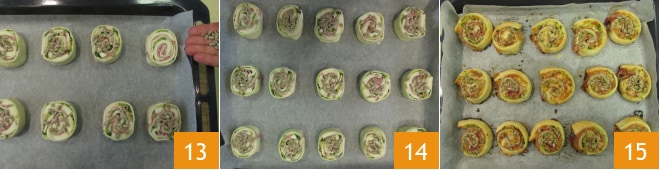 und dekorieren Sie die Oberfläche mit Sonnenblumenkernen 13. Gut, Sie sind bereit zum Backen 14: Die Blätterteig-Schnecken mit Zucchini und Schinken werden im vorgeheizten statischen Ofen bei 200° für etwa 20-25 Minuten gebacken 15.
