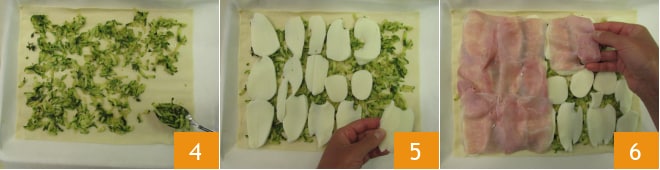 Lassen Sie die Zucchini vollständig abkühlen und rollen Sie dann den Blätterteig aus. Bedecken Sie die Oberfläche mit den Zucchini, lassen Sie dabei 1 cm Abstand zum Rand 4. Fahren Sie fort, den Blätterteig mit den Scheiben Provola 5 und schließlich mit dem gekochten Schinken 6 zu füllen.
