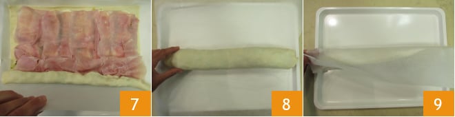 Jetzt rollen Sie den gefüllten Blätterteig sehr vorsichtig mithilfe des Backpapiers auf, achten Sie darauf, ihn nicht nach innen einzurollen; rollen Sie ihn fest auf 7. Wenn Sie die Rolle erhalten haben 8, wickeln Sie sie in das Backpapier ein 9