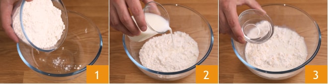 Um die glutenfreie Blechpizza zuzubereiten, geben Sie zunächst die glutenfreie Mehlmischung in eine große Schüssel 1, dann fügen Sie die Milch bei Raumtemperatur 2 und das Wasser ebenfalls bei Raumtemperatur hinzu 3.