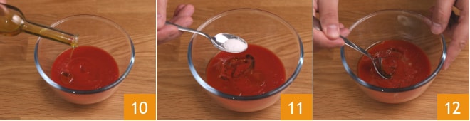 In der Zwischenzeit können Sie die Sauce zubereiten: Geben Sie die Tomatensauce in eine Schüssel und würzen Sie mit Öl 10, Salz 11 und Pfeffer, dann mischen Sie gut 12 und stellen Sie es beiseite.