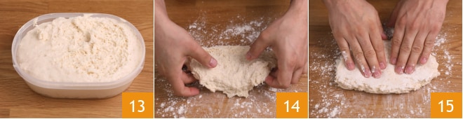 Nach der Gehzeit wird der Teig fest, aber recht klebrig sein 13. Das ist normal: Legen Sie ihn auf eine leicht bemehlte Arbeitsfläche, indem Sie einen Teigschaber verwenden. Klappen Sie den Teig auf die andere Seite 14 und drücken Sie ihn leicht mit den Fingern 15.