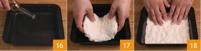 Fetten Sie ein 20x20 cm großes Blech sowohl am Boden als auch an den Rändern mit Öl ein 16, dann legen Sie den Teig hinein 17. Drücken Sie mit den Fingern, um den Teig über die gesamte Fläche des Blechs zu verteilen, aber achten Sie darauf, ihn nicht zu stark zu ziehen, da er leicht reißen kann, weil er kein Gluten enthält 18.