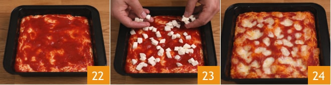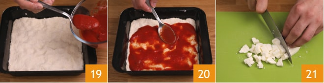 Fügen Sie die Tomatensauce auf der Oberfläche hinzu 19 und verteilen Sie sie gleichmäßig mit der Rückseite eines Löffels 20, dann lassen Sie sie bei Raumtemperatur weitere 2 Stunden gehen. Wenn die Sauce etwas trocken ist, decken Sie das Blech mit einem Tuch ab. Schneiden Sie in der Zwischenzeit den Mozzarella in Würfel 21.