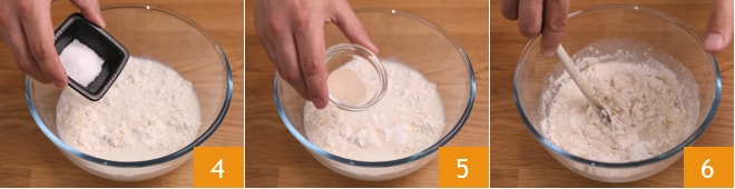 Fügen Sie auch das Salz 4 und die glutenfreie Trockenhefe hinzu 5 (alternativ können Sie 10 g frische Hefe zerbröckeln, achten Sie immer darauf, Produkte mit dem durchgestrichenen Ähren-Symbol zu kaufen), dann beginnen Sie, mit einem Holzlöffel zu rühren 6.