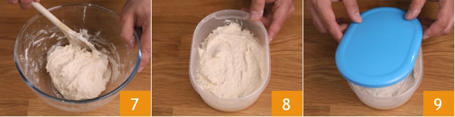 Sie sollten einen feuchten, aber dennoch festen und homogenen Teig erhalten 7. An diesem Punkt geben Sie den Teig in einen Behälter mit Deckel, der mindestens doppelt so hoch ist wie der Teig 8, schließen Sie den Deckel 9 und lassen Sie ihn bei Raumtemperatur für etwa 2 Stunden gehen.