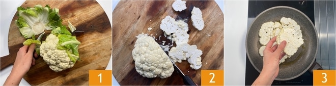 Um den Blumenkohl alla Pizzaiola zuzubereiten, wascht den Blumenkohl, entfernt die eventuell noch vorhandenen Blätter 1 und schneidet dann den Strunk ab, wobei ihr darauf achtet, dass der Teil, an dem die Röschen befestigt sind, intakt bleibt, damit die Scheiben (etwa 1 cm dick) intakt bleiben 2. Sollte er zerbröckeln, keine Sorge, er wird in der Pfanne wieder zusammengefügt. Wir empfehlen, ihn so weit wie möglich ganz zu lassen, um die Konsistenz beim Essen zu verbessern. Erhitzt etwas Öl in einer Antihaftpfanne mit einem Durchmesser von etwa 30-32 cm (stellt sicher, dass ihr einen Deckel habt, den ihr später brauchen werdet). Legt die Blumenkohlscheiben so hinein, dass der Boden gleichmäßig bedeckt ist 3 und würzt mit einer Prise Salz.