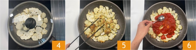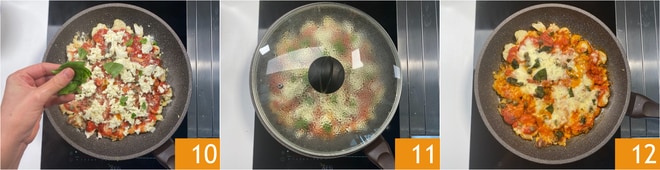 Mit Pfeffer und Basilikumblättern würzen 10. Abdecken 11 und etwa 10 Minuten bei etwas gemäßigterer Hitze kochen. Dann den Deckel abnehmen und weitere 5 Minuten trocknen lassen, dabei die Temperatur wieder leicht erhöhen. Vor dem Servieren den Blumenkohl alla Pizzaiola ein paar Minuten ruhen lassen 12.