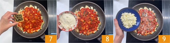 Mit einer Prise Salz würzen, genug, um die Soße zu würzen, die bereits entsalzten und grob zerkleinerten Kapern 7, den geriebenen Pecorino 8 und den zuvor abgetropften und zerkleinerten Mozzarella 9 hinzufügen.