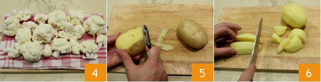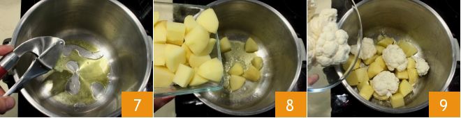 Nehmt den Schnellkochtopf, gebt einen Schuss Öl und die geschälte, gehackte halbe Knoblauchzehe dazu 7. Fügt die Kartoffelstücke 8 und die Blumenkohlröschen 9 hinzu.