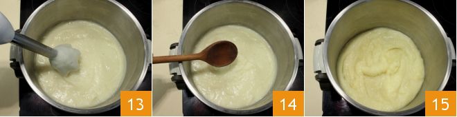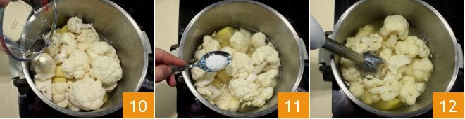 Jetzt gebt das Wasser in den Schnellkochtopf 10, bis es die Höhe des Gemüses erreicht. Dann fügt knapp einen Teelöffel grobes Salz hinzu 11 oder würzt nach Geschmack. Kocht den Blumenkohl und die Kartoffeln 5 Minuten, wobei ihr die Zeit ab dem Pfeifen des Schnellkochtopfs zählt (wenn ihr keinen Schnellkochtopf habt, lasst das Gemüse in zwei getrennten Töpfen in kochendem, nach Geschmack gesalzenem Wasser garen: das dauert etwa 40 Minuten; Kartoffeln und Blumenkohlröschen müssen weich sein). Nach Ablauf der erforderlichen Zeit, wenn das Gemüse gar ist und nachdem ihr den Dampf aus dem Topf abgelassen habt, nehmt ihr den Stabmixer und stellt ihn in den Topf 12.