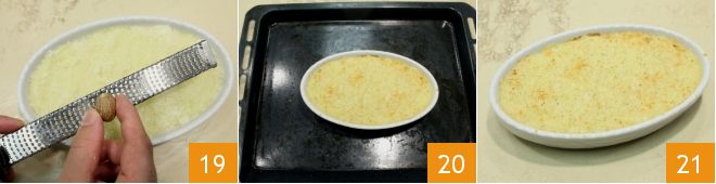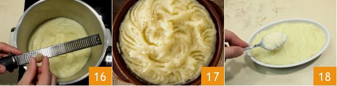 Jetzt reibt ihr die Muskatnuss 16, dann entscheidet, wie ihr das Püree servieren möchtet: Ihr könnt es einfach in eine Schüssel geben und mit den Zinken einer Gabel dekorieren 17; alternativ könnt ihr das Püree so gratinieren: Gebt fein geriebenen Grana hinzu 18,