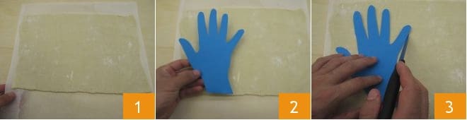 Um die blutige Blätterteighand vorzubereiten, fertige zuerst ein Papiermodell an, indem du den Umriss deiner Hand auf ein Blatt zeichnest und mit einer Schere ausschneidest. Nimm nun die Rolle fertigen Blätterteig und lege sie zusammen mit dem Backpapier auf eine Arbeitsfläche, dann bestäube die Oberfläche mit etwas Mehl 1. Lege das vorbereitete Handmodell darauf 2 und schneide den Teig mit einem scharfen Messer entlang des Umrisses aus 3.