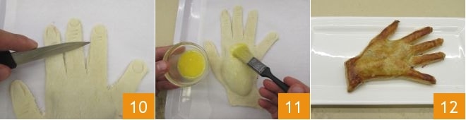 Schneide schließlich kleine horizontale Kerben entlang der Finger, um sie noch realistischer zu machen, achte darauf, den Teig nicht zu tief einzuschneiden 10. Nun bepinsle die Oberfläche der gefüllten Hand mit dem verquirlten Eigelb 11 und backe sie im vorgeheizten statischen Ofen bei 215° für etwa 15-20 Minuten. Sobald sie goldbraun ist 12, nimm die blutige Blätterteighand aus dem Ofen und lass sie abkühlen, bevor du sie servierst und anschneidest!