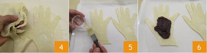 Wiederhole den Vorgang, um eine zweite Handform aus dem Teig zu schneiden, und entferne den überschüssigen Teig 4. Bepinsele die Ränder einer der beiden Formen mit Wasser 5, dann gib die Himbeerkonfitüre in die Mitte 6.