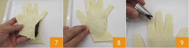 Bedecke die Füllung mit der zweiten Blätterteigform, indem du die Ränder aufeinander bringst 7 und sie vorsichtig mit den Fingern andrückst 8. Verwende eine Saint-Honoré-Tülle, um die Form der Nägel zu zeichnen, indem du sie sanft auf die Fingerspitzen drückst 9.
