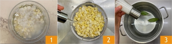 Um Bohnen und Zichorie zuzubereiten, lassen Sie zuerst die getrockneten Bohnen über Nacht einweichen 1. Am nächsten Tag abgießen und unter fließendem Wasser abspülen 2. Bringen Sie einen Topf mit reichlich Wasser, Salz und 2 Lorbeerblättern zum Kochen 3.