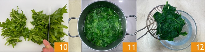 Stellen Sie das Püree beiseite und widmen Sie sich den Zichorien: Waschen Sie sie und entfernen Sie den unteren Teil der Stiele 10, dann blanchieren Sie sie für ein paar Minuten 11. Die Zichorien abgießen und in eine Schüssel mit Eiswasser geben, um die Farbe zu erhalten 12.