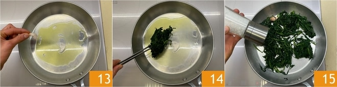 In einer Pfanne erhitzen Sie etwas Öl mit einer Knoblauchzehe 13, dann fügen Sie die abgetropften Zichorien hinzu, um überschüssiges Wasser zu entfernen 14. Braten Sie die Zichorien mit einer Prise Salz für ein paar Minuten an 15.