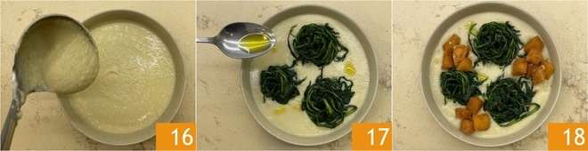 Sie sind bereit zum Anrichten: Geben Sie das Bohnenpüree auf den Boden der Teller 16, arrangieren Sie die Zichorien in Form eines Nestes und beträufeln Sie es mit etwas rohem Öl 17. Garnieren Sie mit knusprigen Croutons und servieren Sie Ihre Bohnen und Zichorie sofort!