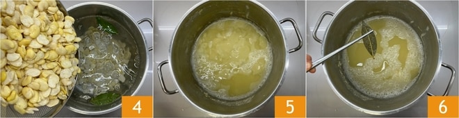 Geben Sie die getrockneten Bohnen hinzu 4 und lassen Sie sie bei schwacher Hitze 2 Stunden lang kochen 5. Entfernen Sie am Ende der Kochzeit die Lorbeerblätter 6.