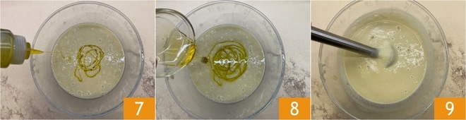 Geben Sie die gekochten Bohnen in eine Schüssel, fügen Sie das Öl 7 und den Honig 8 hinzu, dann mixen Sie mit einem Stabmixer, bis Sie ein Püree erhalten 9.