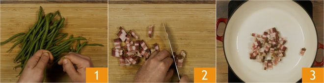 Um die Bohnen in Sauce auf Bauernart zuzubereiten, müssen Sie zuerst die Bohnen waschen und die Enden entfernen 1, dann den Speck in Streifen schneiden 2. Stellen Sie einen Topf auf den Herd, vorzugsweise aus Gusseisen oder mit dickem Boden, und geben Sie den Speck hinzu 3.