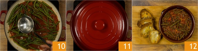 Fügen Sie eine Kelle heißes Wasser hinzu 10, decken Sie den Topf mit einem Deckel ab 11 und lassen Sie etwa 50 Minuten kochen, oder bis die Bohnen zart sind. Stellen Sie sicher, dass die Zubereitung immer feucht bleibt, fügen Sie bei Bedarf etwas heißes Wasser hinzu. Servieren Sie die Bohnen in Sauce auf Bauernart, begleitet von geröstetem Brot 12.