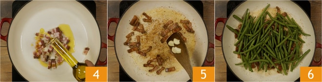 Gießen Sie einen Schuss extra natives Olivenöl hinzu 4. Lassen Sie den Speck gut anbraten. Fast zum Ende des Anbratens fügen Sie den geschälten Knoblauch, halbiert und ohne Keim hinzu 5. Nach ein paar Momenten, gerade genug Zeit, um das Öl mit dem Knoblauch zu aromatisieren, fügen Sie auch die zuvor gereinigten Bohnen hinzu 6. Lassen Sie sie bei mittlerer Hitze anbraten und rühren Sie häufig für ein paar Minuten um.