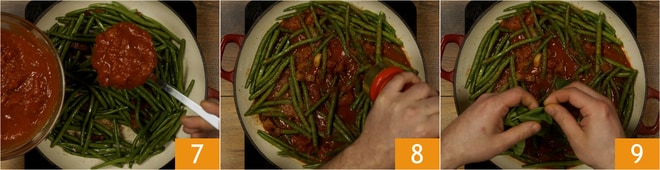 Fügen Sie dann auch die gehackten, geschälten Tomaten hinzu 7. Würzen Sie mit Salz und aromatisieren Sie die Zubereitung mit schwarzem Pfeffer 8, fügen Sie die zerrissenen Blätter von Petersilie und Basilikum hinzu 9.