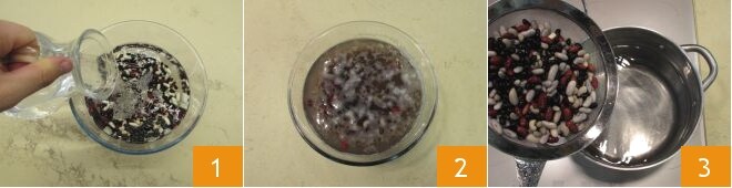 Um den Salat aus gemischten Bohnen und Kürbis zuzubereiten, beginnen Sie mit den Hülsenfrüchten. Die Mischung aus getrockneten Bohnen (Cannellini, Borlotti und Augenbohnen) muss zum Rehydrieren ins Wasser gelegt werden 1, damit sie schnell gekocht werden können. Lassen Sie sie 24 Stunden lang rehydrieren 2: Es ist ratsam, nach den ersten 12 Stunden das Wasser zu wechseln, um die Verunreinigungen zu entfernen, die an die Oberfläche kommen. Nach der Zeit spülen Sie die Bohnen ab und geben Sie sie in einen Topf mit reichlich kaltem Wasser 3,