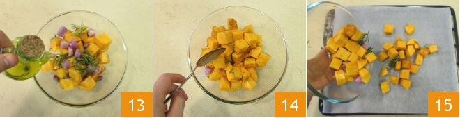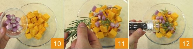 Fügen Sie sie dem Kürbis in einer Schüssel hinzu 10, würzen Sie mit Rosmarinnadeln 11. Salzen und pfeffern Sie nach Belieben 12.