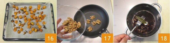 Backen Sie im vorgeheizten statischen Ofen bei 220° für etwa 30 Minuten. Sobald es fertig ist, nehmen Sie Kürbis und Schalotte aus dem Ofen und lassen Sie sie vollständig abkühlen 16. Rösten Sie die Walnusskerne kurz in einer Pfanne 17 bei mittlerer Hitze. Lassen Sie sie dann abkühlen. In der Zwischenzeit sind die Bohnen gekocht; entfernen Sie das Lorbeerblatt 18