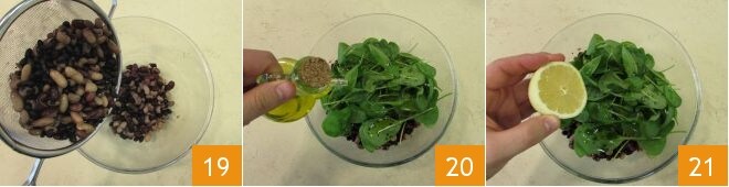 und gießen Sie die Hülsenfrüchte ab 19. Lassen Sie sie vollständig abkühlen. Sobald sie kalt sind, können Sie den frischen Spinat (zuvor gewaschen und getrocknet) hinzufügen, mit Öl 20, Zitronensaft 21, Salz und Pfeffer nach Belieben würzen. Mischen Sie alles