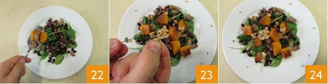 bevor Sie anrichten: Gießen Sie die Mischung aus Hülsenfrüchten und Spinat auf einen Servierteller, mit dem Kürbis 22, und vervollständigen Sie mit den Walnusskernen und frischen Thymianblättern 23. Ihr Bohnensalat mit gemischtem Kürbis ist bereit, genossen zu werden 24!