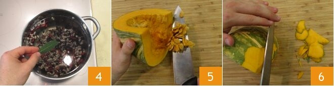 fügen Sie auch ein Lorbeerblatt hinzu und setzen Sie es auf das Feuer 4. Lassen Sie es aufkochen und dann ein paar Stunden köcheln, um regelmäßig die Konsistenz zu überprüfen, damit sie Ihre bevorzugte Konsistenz erreichen. Es ist wichtig, dass die Bohnen nach dem Kochen noch ein wenig knackig sind, perfekt, um im Salat umgerührt zu werden. Während die Bohnen kochen, können Sie sich dem Kürbis widmen: Entfernen Sie die inneren Kerne 5 und schälen Sie die Schale ab 6.