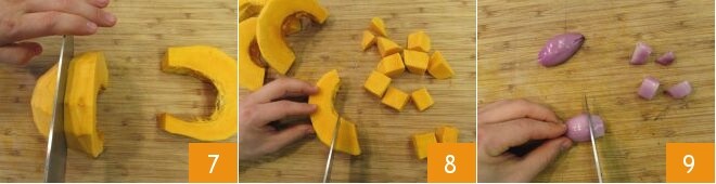 Teilen Sie das Fruchtfleisch zuerst in dicke Scheiben 7 und dann in etwa 2 cm große Würfel 8. Sie sollten etwa 600 g Fruchtfleisch erhalten. Putzen Sie die Schalotte und schneiden Sie sie in nicht zu dünne Scheiben 9.